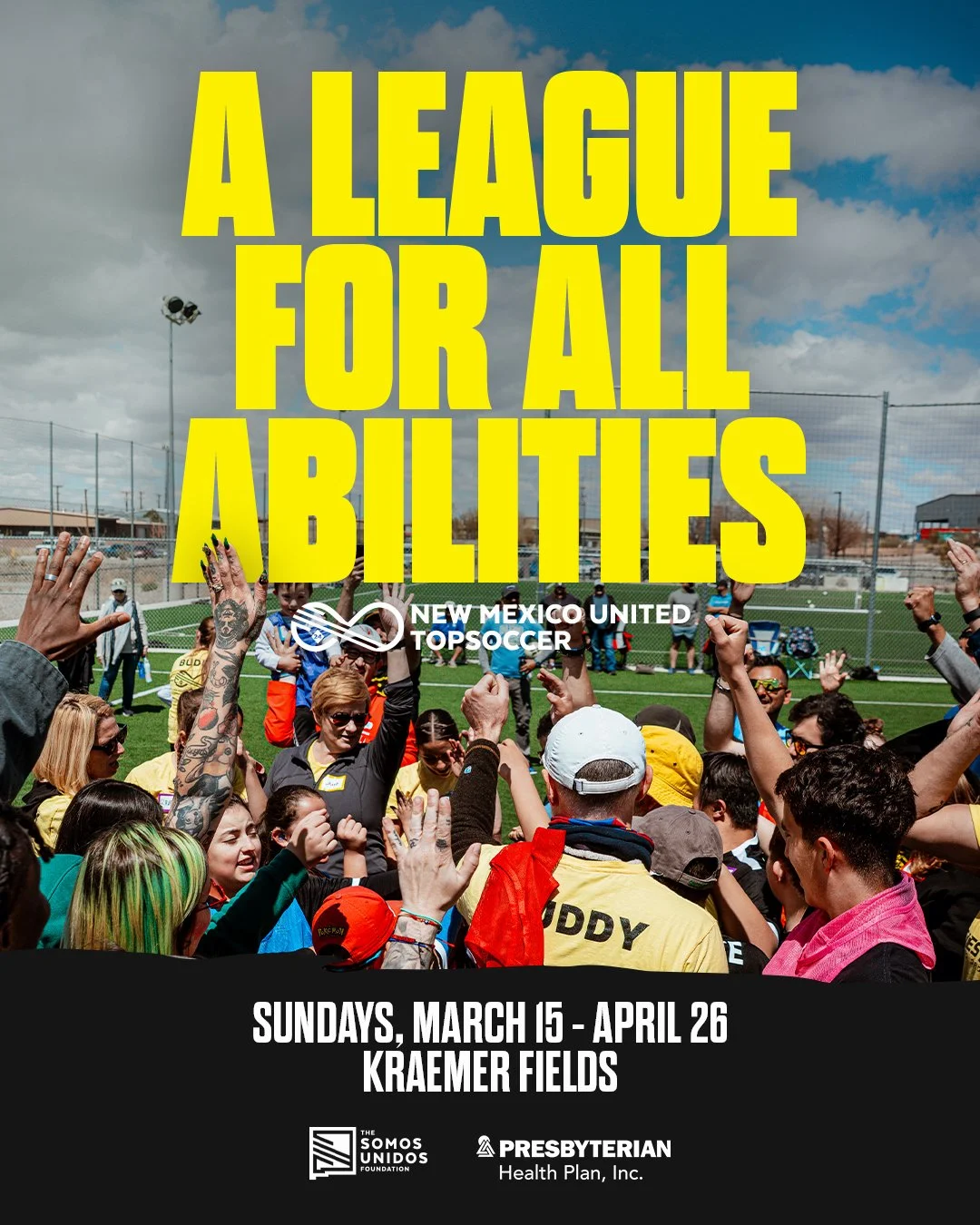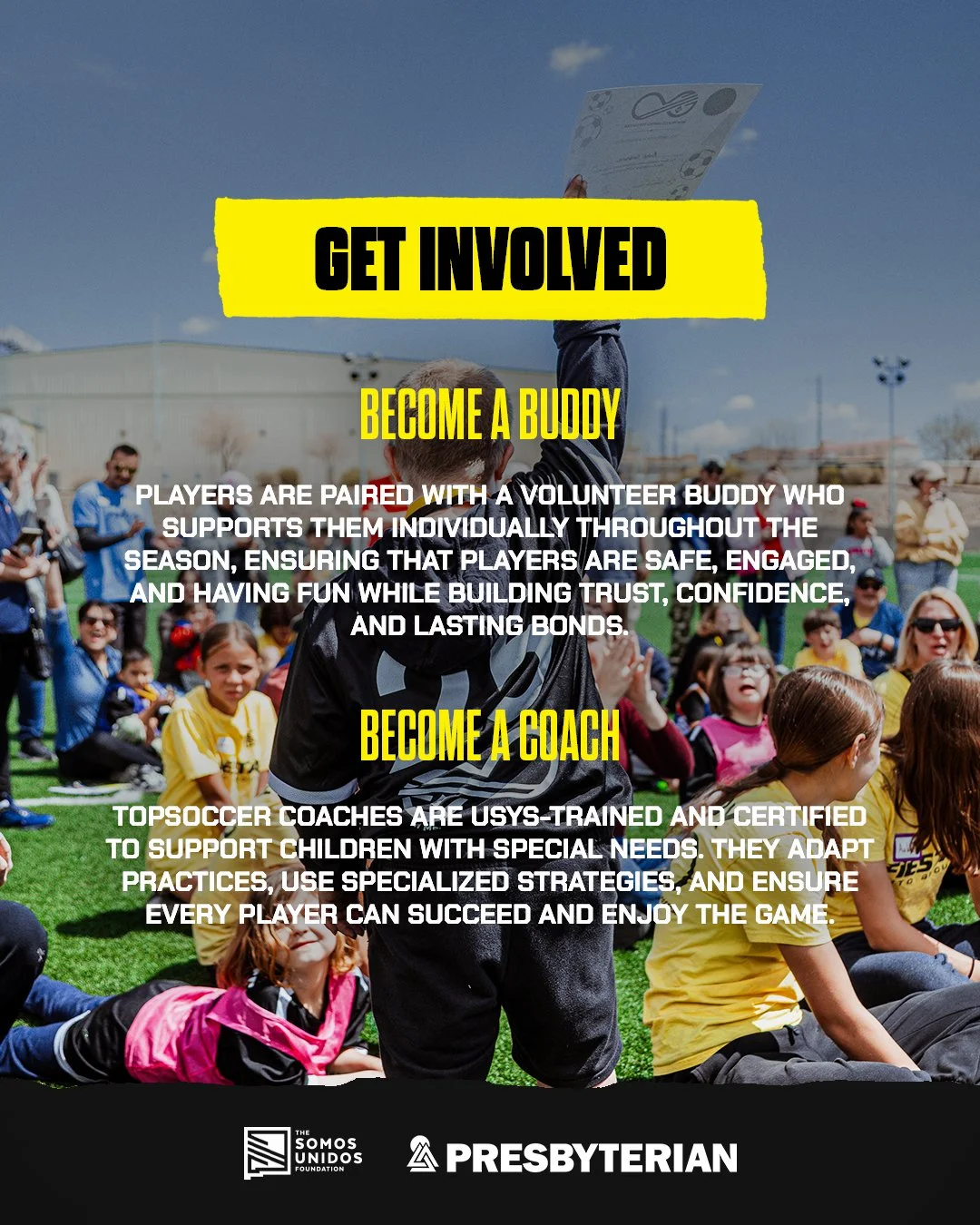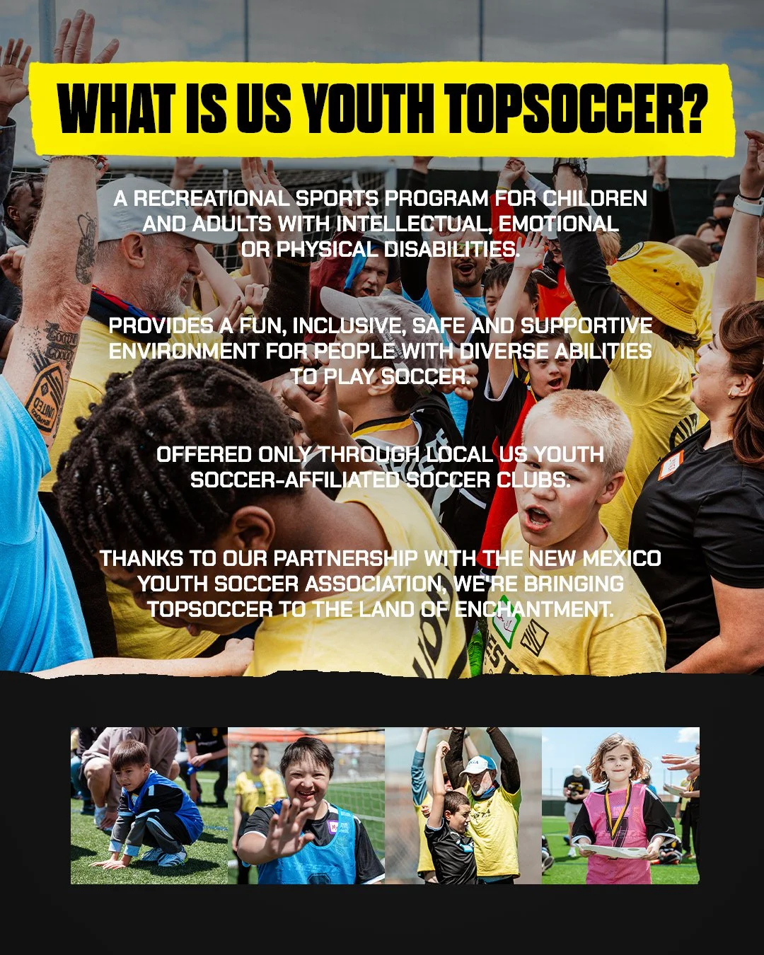 We are so excited and proud to welcome you to New Mexico United TOPSoccer, a FREE program aimed at helping New Mexicans of EVERY ability level fall in love with the Beautiful Game! Learn how to become a TOPSoccer Athlete, Coach, or Buddy! Sign up today!